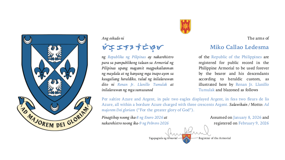 Assumed/granting authority: Assumed, January 8, 2026. Registered, Philippine Armorial, February 9, 2026.