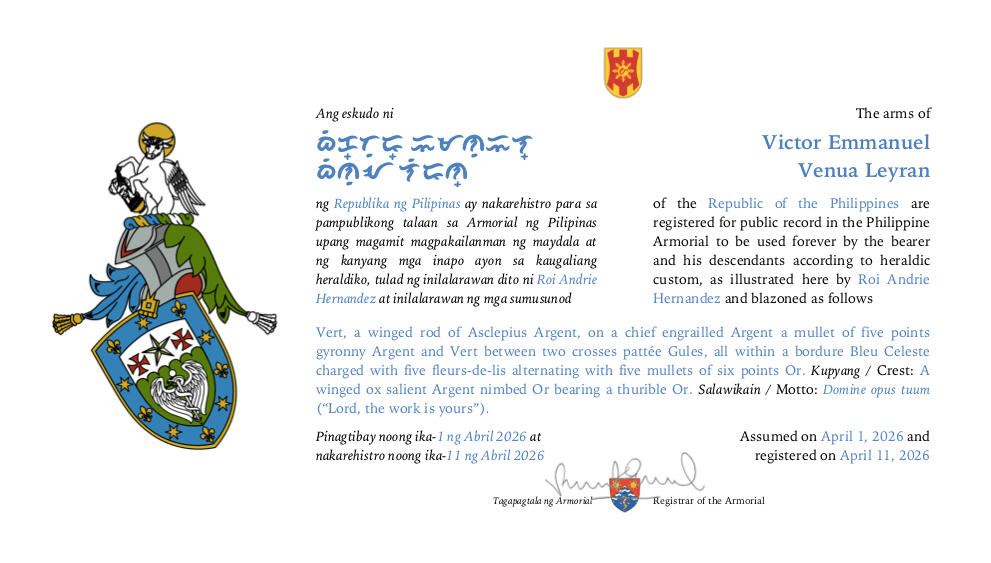 Assumed/granting autority: Assumed, April 1, 2026. Registered, Philippine Armorial, April 11, 2026.