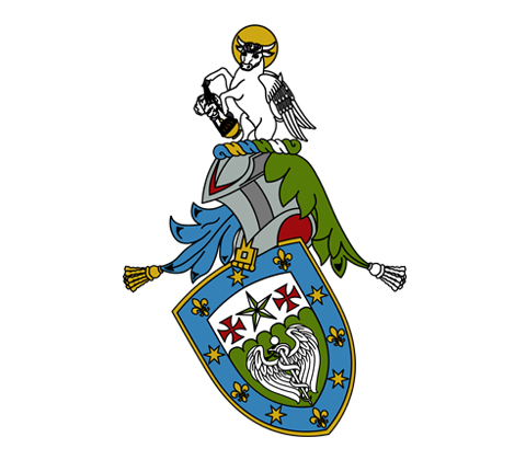In the border, the five stars of St. John Nepomucene refer to the Armiger’s parish patron saint, while the fleur de lis symbolize the Armiger’s Marian devotion.